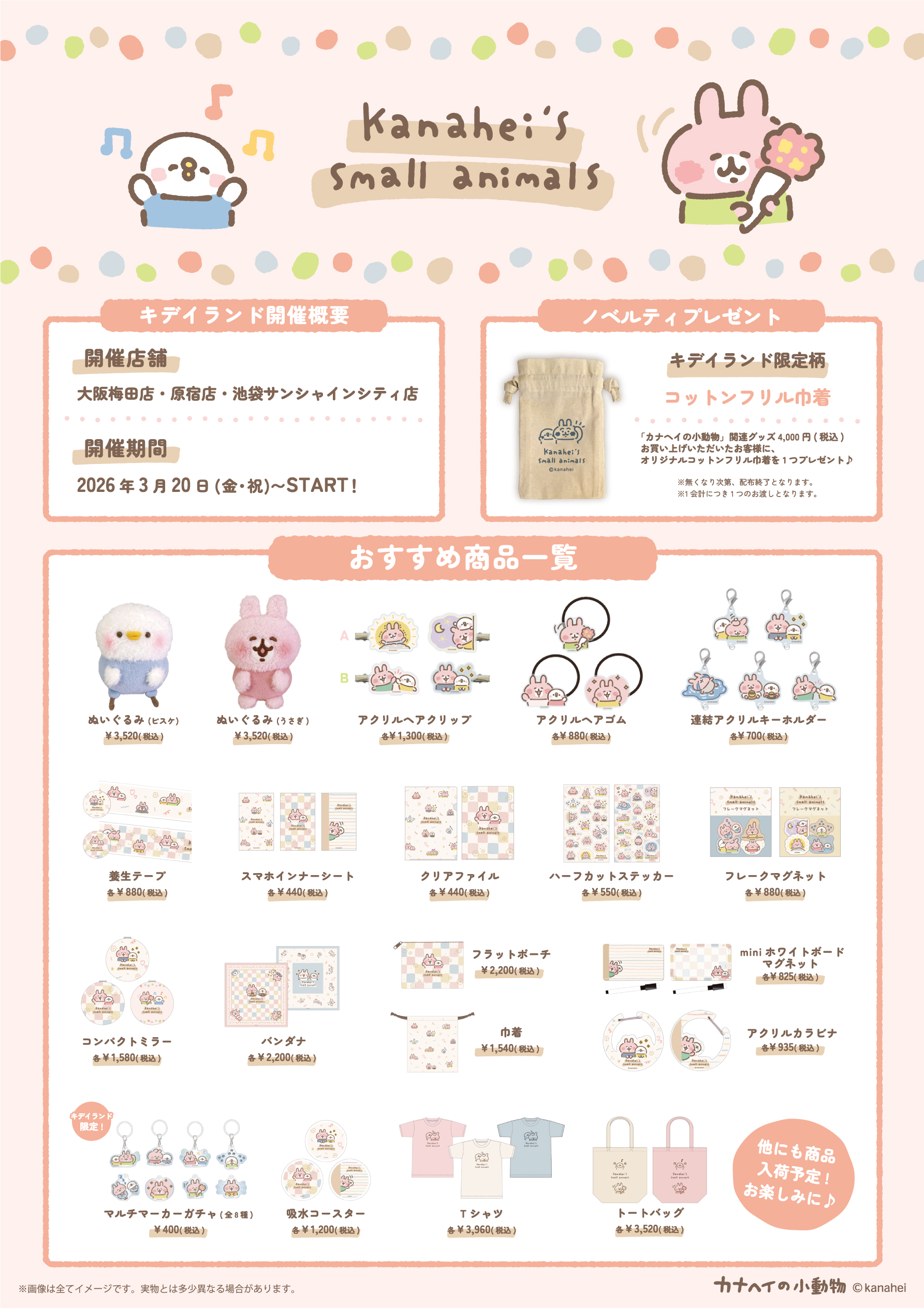2026年3月20日(金)〜ゆるっとほっこりフェア”ソフトに伝わるスタンプ日和”@ 『カナヘイのおみせ』 3店舗 カナヘイの小動物 ゆるっとほっこりフェア”ソフトに伝わるスタンプ日和 商品取り扱い店舗一覧 関東 原宿店 / 池袋サンシャインシティ店 関西 大阪梅田店 商品に関するお問合せは、上記各店まで