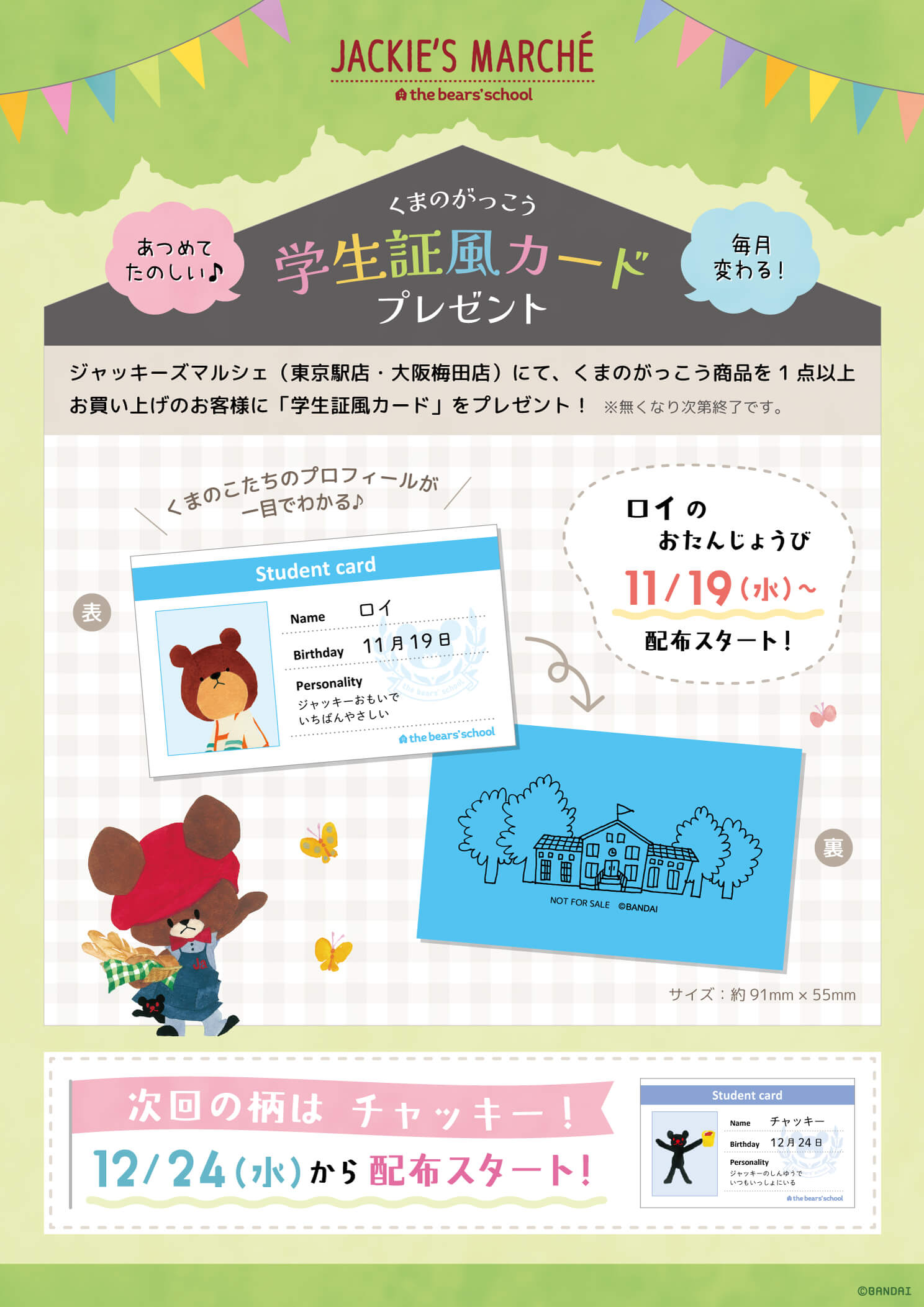 集めて楽しい♪毎月変わる!「学生証風カード」プレゼント @ 『ジャッキーズマルシェ』東京駅店/大阪梅田店 ※ジャッキーズマルシェ大阪梅田店は阪急三番街休館日に伴い、11/20(木)〜配布を開始いたします。あらかじめご了承くださいませ。 商品に関するお問合せは、東京駅店 / 大阪梅田店まで