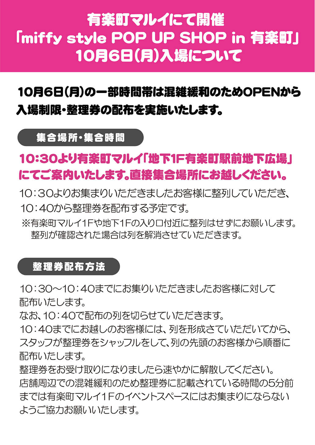 【入店方法に関して】10月6日(月)miffy style POP UP SHOP in 有楽町