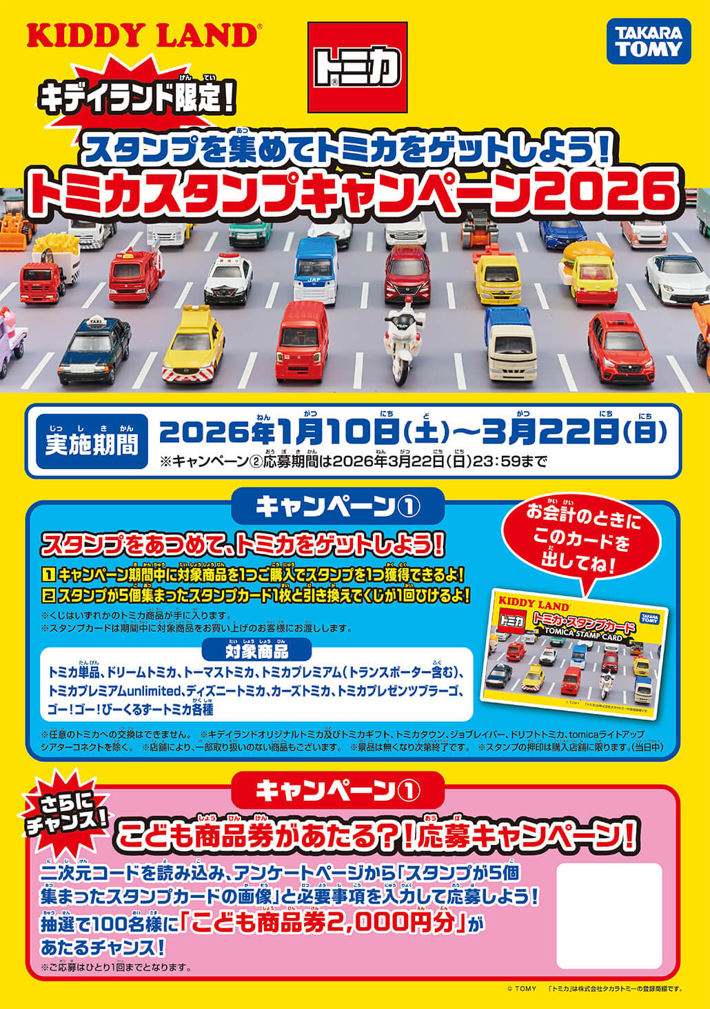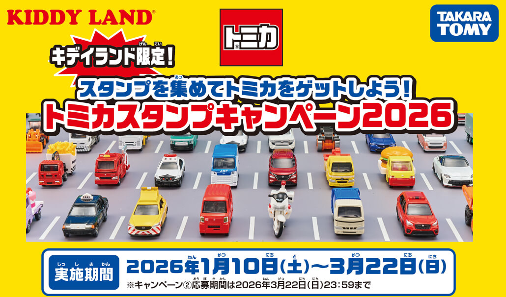 2026年1月10日(土)~開催!キデイランド限定トミカスタンプキャンペーン @ キデイランド26店舗 キデイランド限定トミカスタンプキャンペーン取り扱い店舗一覧 関東 原宿店 / 新宿店 / 光が丘店 / 吉祥寺店 / 二子玉川店 / 池袋サンシャインシティ店 / 武蔵小杉店 / 港北ニュータウン店 / ららぽーと湘南平塚店 / ららぽーと富士見店 / 浦和美園店 中部 清水店 / 名古屋パルコ店 関西 大阪梅田店 / ららぽーとEXPOCITY店 / 堺鉄砲町店 / 京都四条河原町店 / 神戸店 / 三宮店 / ピオレ姫路店 中国・四国 広島パルコ店 / 高松店 九州 福岡パルコ店 / アミュプラザくまもと店 / アミュプラザおおいた店 / 鹿児島店 商品に関するお問合せは、上記各店まで
